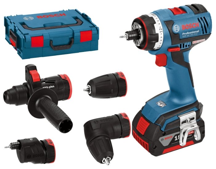 Шуруповерт GSR 18V-60 FC; 1/2 вкладыш для кейса L-BOXX под принадлежности; 1/2 вкладыша для кейса L-BOXX под инструмент; 2 аккумулятора Li-Ion емкостью 5,0 Ач; быстрозарядное устройство AL 1880 CV; насадка GFA 18-M; насадка GFA 18-E; насадка GFA 18-W; насадка GFA 18-H; L-BOXX 136.
