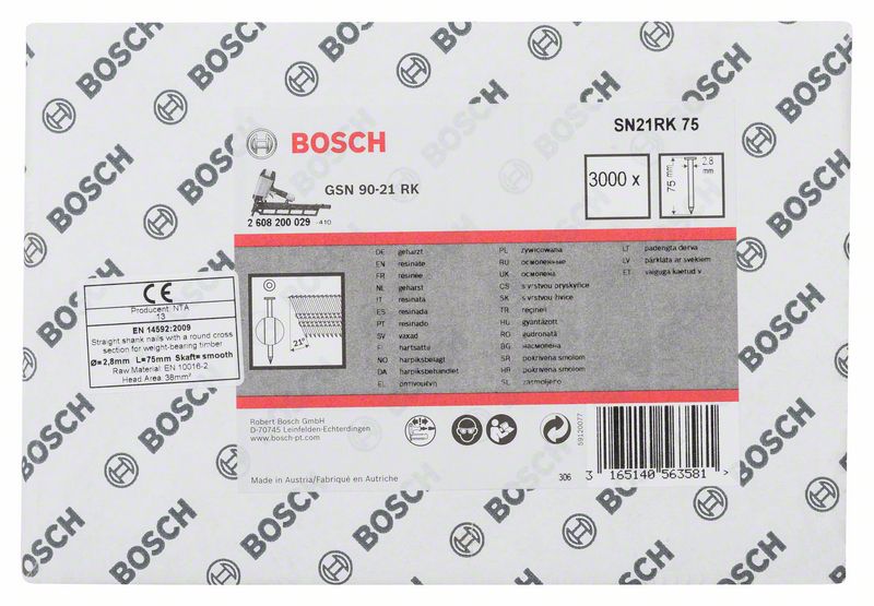 Гвозди с круглой головкой 2608200029 в обойме под углом 21 градус, предназначены для работы с пневматическим гвоздезабивателем Bosch в помещении. Подходят для использования в рамках класса 1 (DIN EN 1995-1-1). Гладкая структура позволяет гвоздю легко проникать в материал. Покрытие смолой обеспечивает легкое забивание гвоздей в материал и прочное крепление. Угол наклона 21 градус обеспечивает надежное и прочное крепление реечных гвоздей при работе с деревом, кровлей, ящиками и паллетами, а также с дверными, оконными и мебельными рамами. Реечные гвозди 21 градус с полной головкой изготавливаются в Австрии и имеют неизменно высокое качество. Гвозди 2608200029 с круглой головкой в обойме идеально подходят для гвоздезабивателя GSN 90-21 RK Professional.