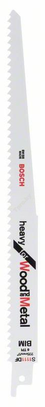 Сабельное пильное полотно S 1111 DF Heavy for Wood and Metal позволяет выполнять быстрые пропилы в дереве и металле Крупный шаг зубьев (4,3 мм) и разведенные зубья позволяют достичь быстрого результата Материал полотна средней толщины (1,25 мм) обеспечивает прекрасный баланс скорости, гибкости и устойчивости при резке Биметаллическое полотно для металлических элементов в древесине — незакаленных гвоздей, мягкой стали и цветных металлов
