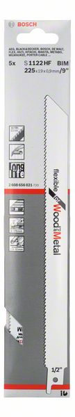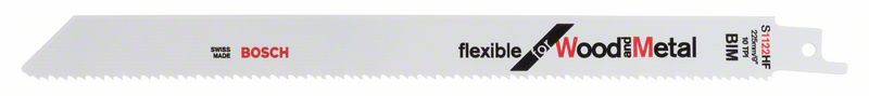 Сабельное пильное полотно S 1122 HF Flexible for Wood and Metal позволяет выполнять срезы заподлицо в дереве и металле Стандартная ширина (0,9 мм) и стандартная длина (225 мм) позволяют выполнять срезы заподлицо Биметаллическое полотно оптимизировано для ремонта поддонов Средний шаг зубьев (2,5 мм) позволяет полотну резать незакаленные гвозди и скобы, применяющиеся в производстве поддонов