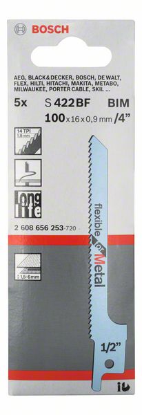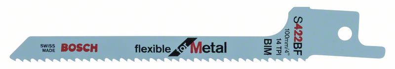 Сабельное пильное полотно S 422 BF Flexible for Metal предназначено для криволинейных пропилов компактными пилами Скошенное полотно для отличных криволинейных пропилов Биметаллическое полотно рассчитано на длительный срок службы при резке листовой стали средней прочности Мелкий шаг зубьев (1,8 мм) позволяет резать листовой металл толщиной 1,5–6 мм