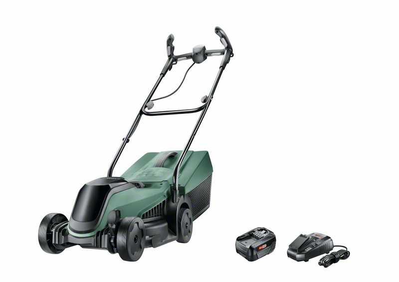 Газонокосилка; травосборник; зарядное устройство AL 1810 CV; аккумуляторная батарея PBA 18V 4.0 Ah W-C; инструкция; упаковка.