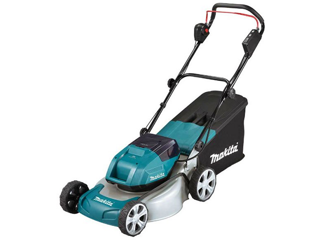 В газонокосилке Makita DLM460Z используются два литиевых слайдера напряжением 18 В. Буква Z в обозначении говорит о том, что агрегат ими не комплектуется. Это вряд ли можно считать недостатком, ведь установить в него можно широко распространенные блоки серии BL18XX без ограничений по емкости – от 1,5 до 6 А-час.